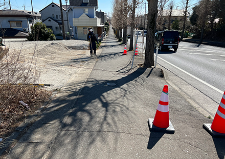 (既存の歩道用U字溝から車両乗り入れ用のU字溝に交換、街路樹の植え替え、路床・路盤・舗装の施工)
